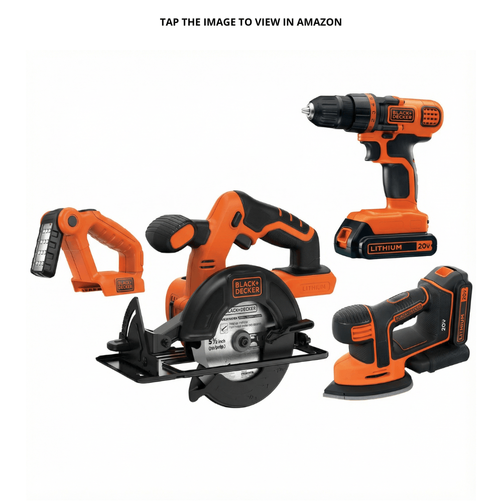 A cordless 4-tool set that covers drilling, cutting, sanding, and lighting with one battery platform.