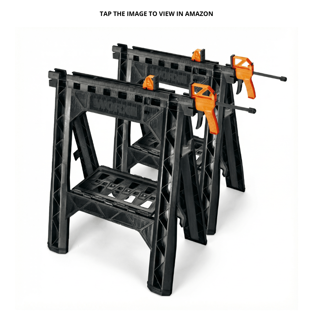 A pair of lightweight sawhorses with built-in bar clamps to hold workpieces securely.